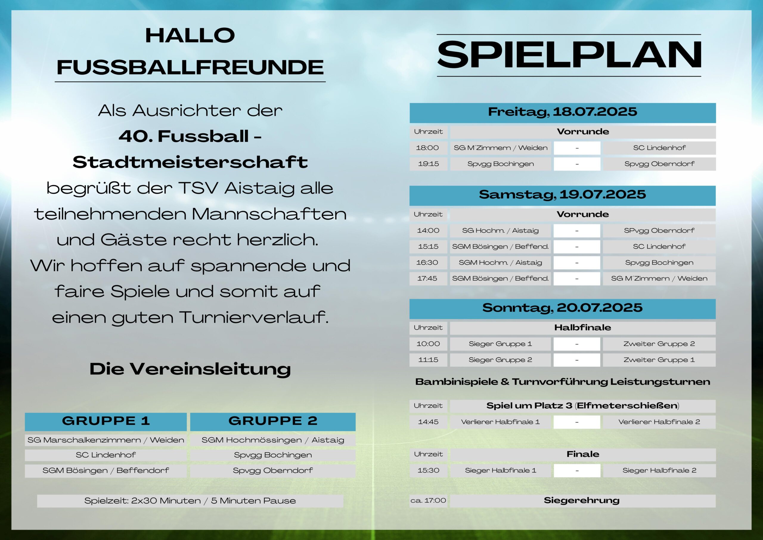 Als Ausrichter der 40. Fußball-Stadtmeisterschaft begrüßen wir alle teilnehmenden Mannschaften und Gäste recht herzlich auf dem Sportplatz in Aistaig.